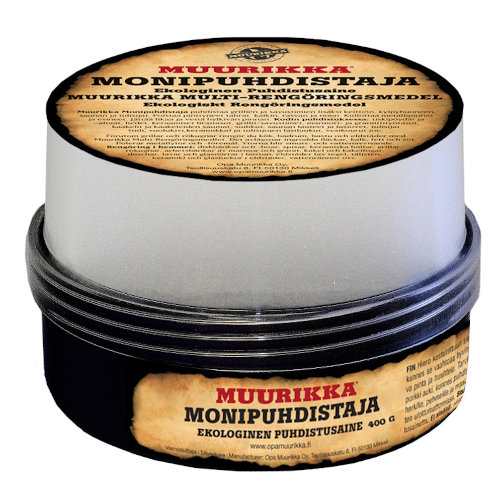 Muurikka Monipuhdistaja on monikäyttöinen ja ympäristöystävällinen puhdistusaine, joka sopii lähes mille tahansa pinnalle. Tämä väri- ja säilöntäaineeton puhdistuskivi poistaa tehokkaasti pinttyneen lian, rasvan ja noen naarmuttamatta tai syövyttämättä. Se on täydellinen valinta niin keittiöön, kylpyhuoneeseen kuin ulkokäyttöön, kuten grillien ja savustimien puhdistamiseen.
