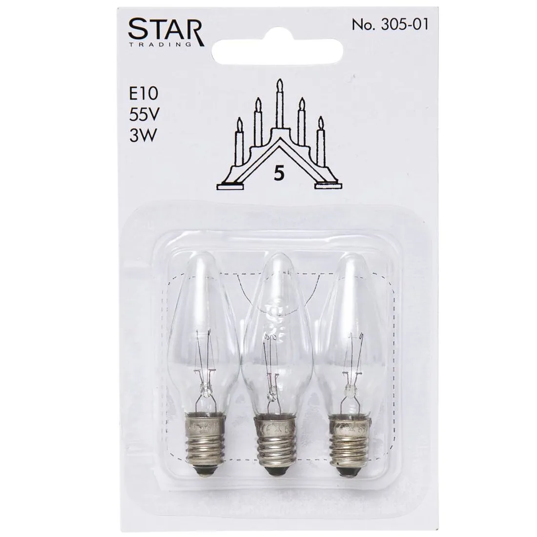 Pakkaus sisältää 3 kirkaslasista varalamppua, jotka sopivat Starin 4–5 -haaraisiin kynttelikköihin, joissa on tavallinen seinäpistoke. Lamput soveltuvat sisäkäyttöön, ja niiden lämmin, kirkas valo luo perinteisen ja kodikkaan tunnelman.