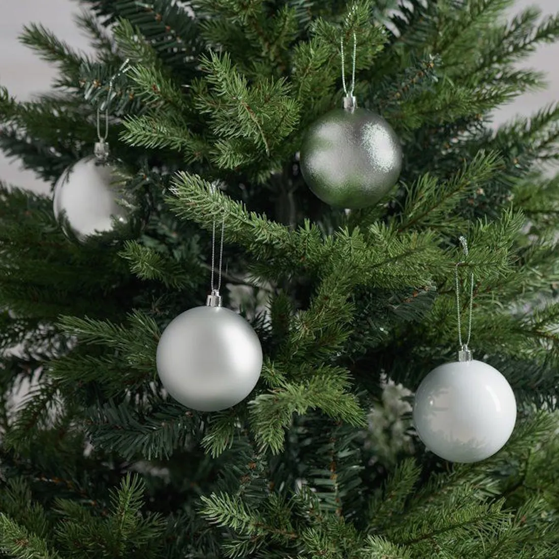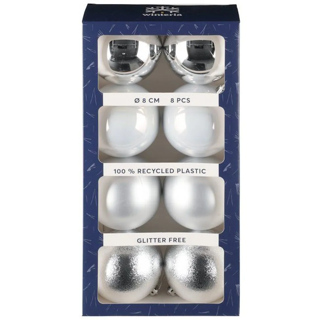 Winteria Kuusenpallo 8 cm Hopea Mix – vastuullista juhlan säihkettä ja ajattoman hopeista tyylikkyyttä joulun sisustukseen.