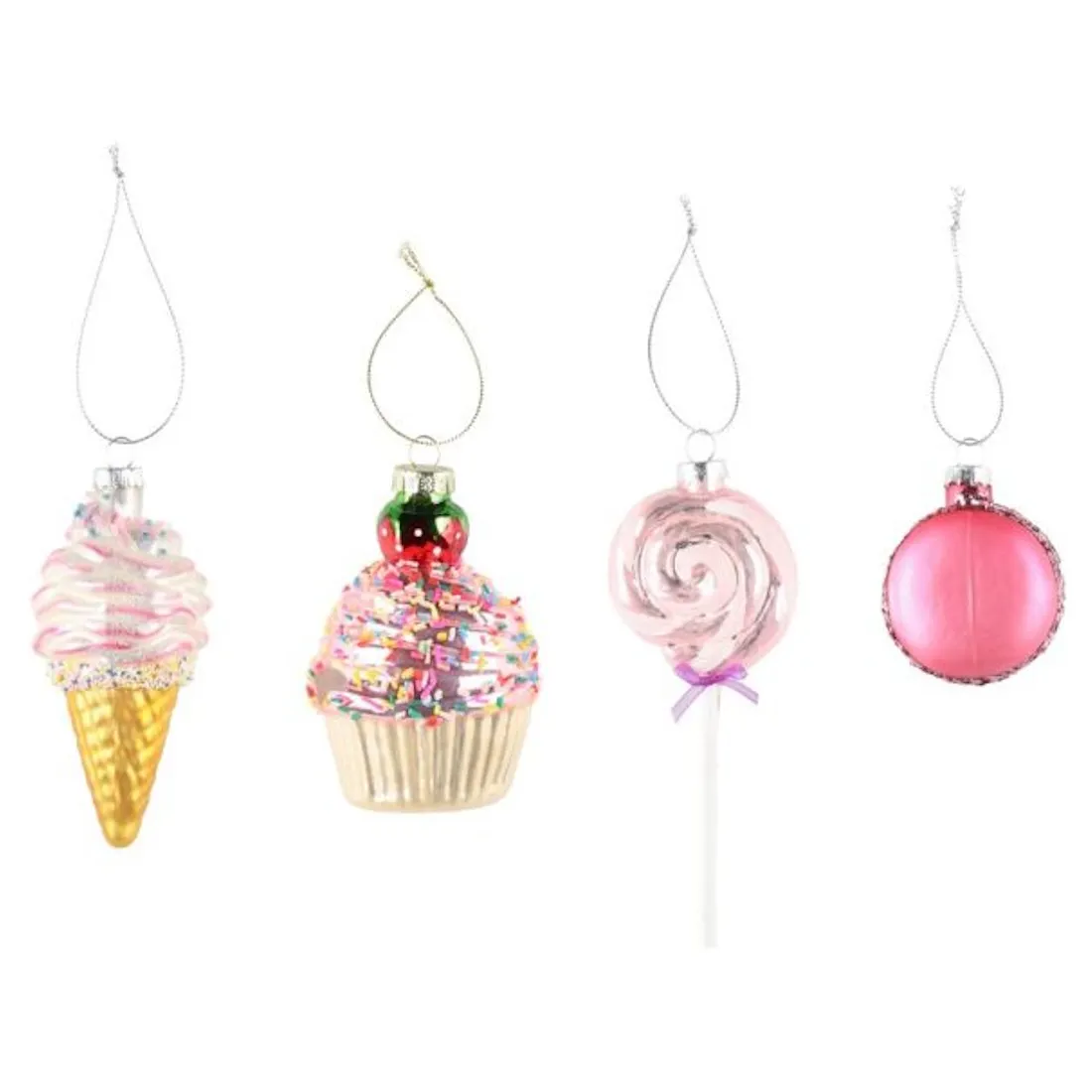 4 erilaista; karkkitikku, kuppikakku, macaron, jäätelö.