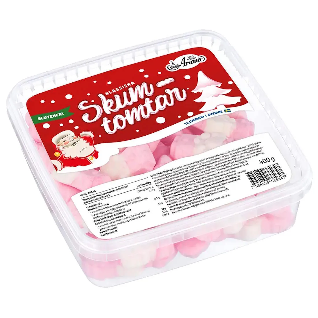 Aroma Vaahtotontut tuovat joulun ilon ja makean hetken jokaiseen kotiin! Pehmeät, vaahtomaiset tontut sulavat suussa ja maistuvat koko perheelle. Täydellinen herkku joulun ajan juhlahetkiin, lahjaksi tai naposteltavaksi glögin kanssa.