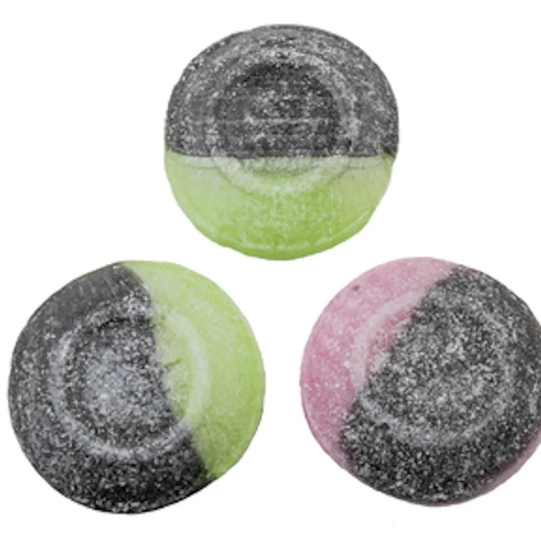 Sokeri, glukoosisiirappi, ammoniumkloridi, happamuudensäätöaine (omenahappo), lakritsijauhe, aromit, väriaineet (E141, E100, E153, E120).