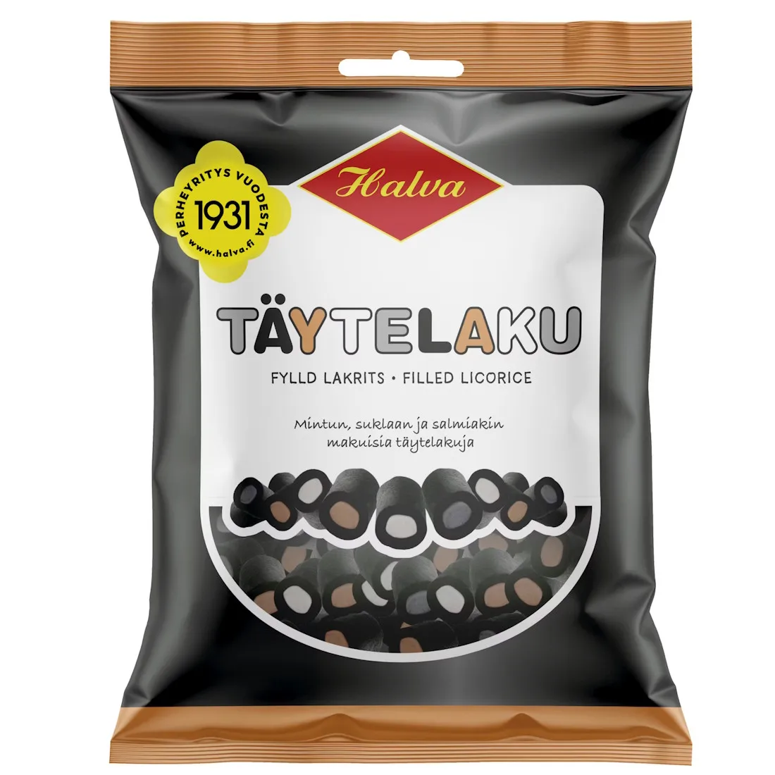 Herkullinen minttu-, suklaa- ja salmiakkitäytelakusekoitus. Halvan maukasta lakritsaa vuodesta 1931. Valmistettu Pitäjänmäellä, Helsingissä.
