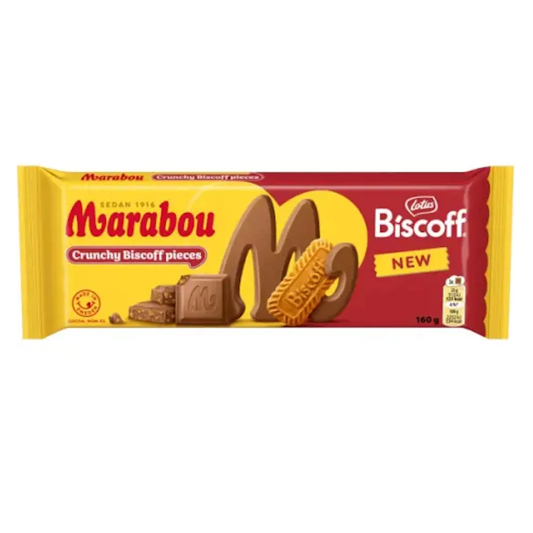 Marabou Chokladkaka Lotus Biscoff on kun kaksi klassikkoa kohtaavat! Kermainen ruotsalainen Marabou maitosuklaa täytettynä murskatuilla Lotus Biscoff -kekseillä - täydellinen tasapaino pehmeän suklaan ja rapeiden karamellekeksien välillä. Jokainen pala antaa sinulle sekä suklaata että sen riippuvuutta aiheuttavan Biscoff-maun. Täydellinen sinulle joka rakastat sekä Marabouta että Lotusta, tai haluat jotain vähän erilaista kuin tavallinen suklaa!