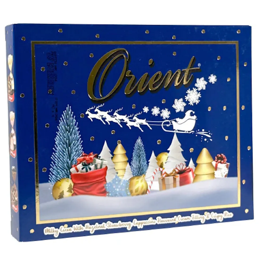 Orient Blue Christmas Box with Chocolate Truffles 90g on sininen joulurasia, jossa on 90 grammaa suklaatryffeleitä, joiden makuina on hasselpähkinä, mansikka ja cappuccino.