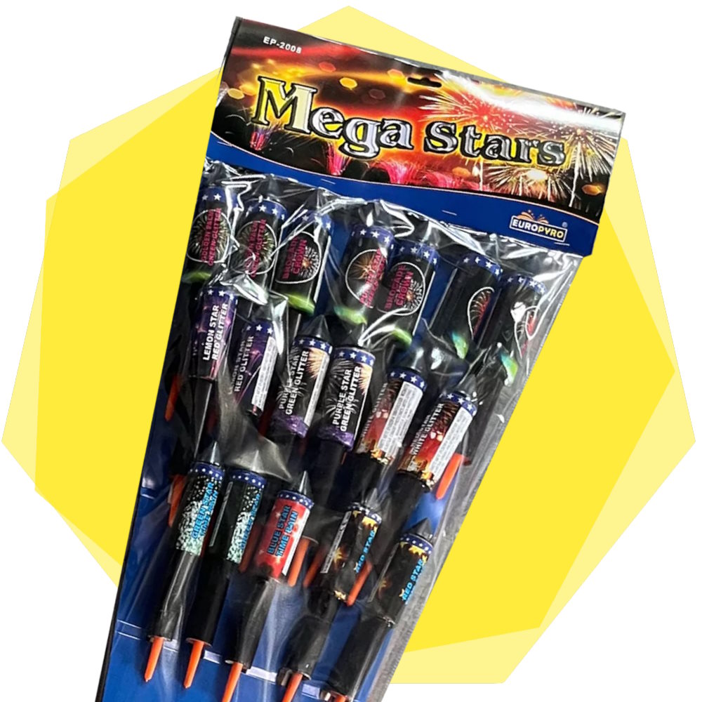 Mega Stars -raketit tarjoavat runsaan kirjon efektejä aina hohtavista välähdyksistä räjähtäviin palmuihin ja värikkäisiin paukkuihin. Helppokäyttöisyytensä ansiosta paketti sopii sekä aloitteleville ilotulitteiden käyttäjille että kokeneemmillekin pyroharrastajille.