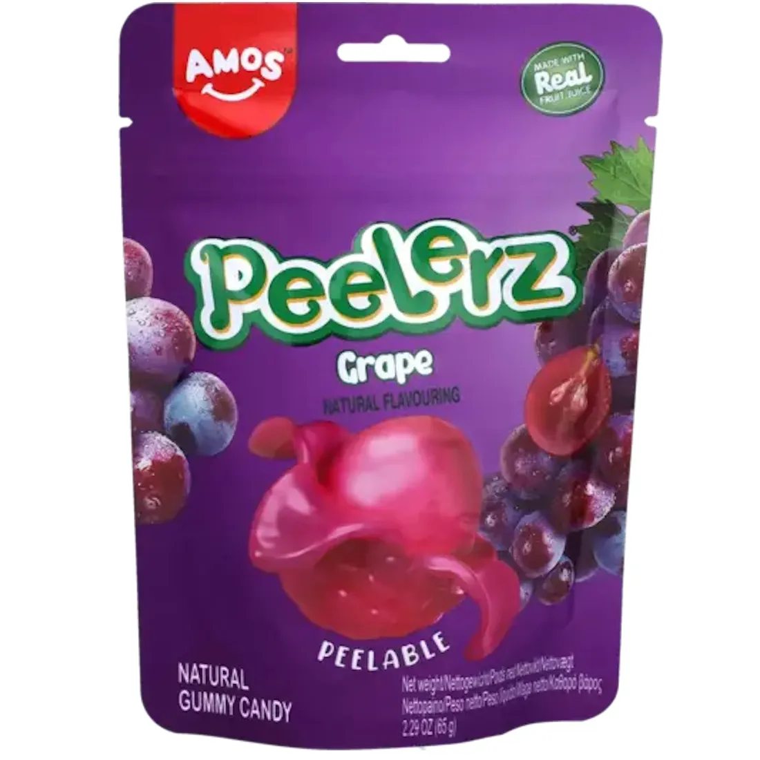 Peelerz’s Grape Gummies-godis har ett mjukt, lila yttre skikt som kan skalas av för att avslöja en mjuk kärna med druvsmak. Detta läckra och unika godis är format som en liten druvklase.