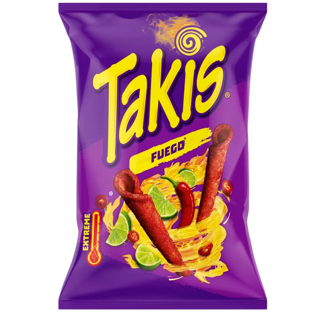 Takis Fuego är en av världens mest populära majsbaserade snacks – känd för sin intensiva hetta, friska lime och djup röda färg. Dessa rullade, superkrispiga majschips bjuder på en kraftfull smakupplevelse, perfekt för dig som vill ha riktig sting i snacksen.