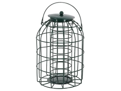 Talgbollautomat för fåglar. Enkel att fylla på och rengöra. Rymmer 5 talgbollar. Två monteringsalternativ – kan hängas i ett träd eller monteras på en pinne.