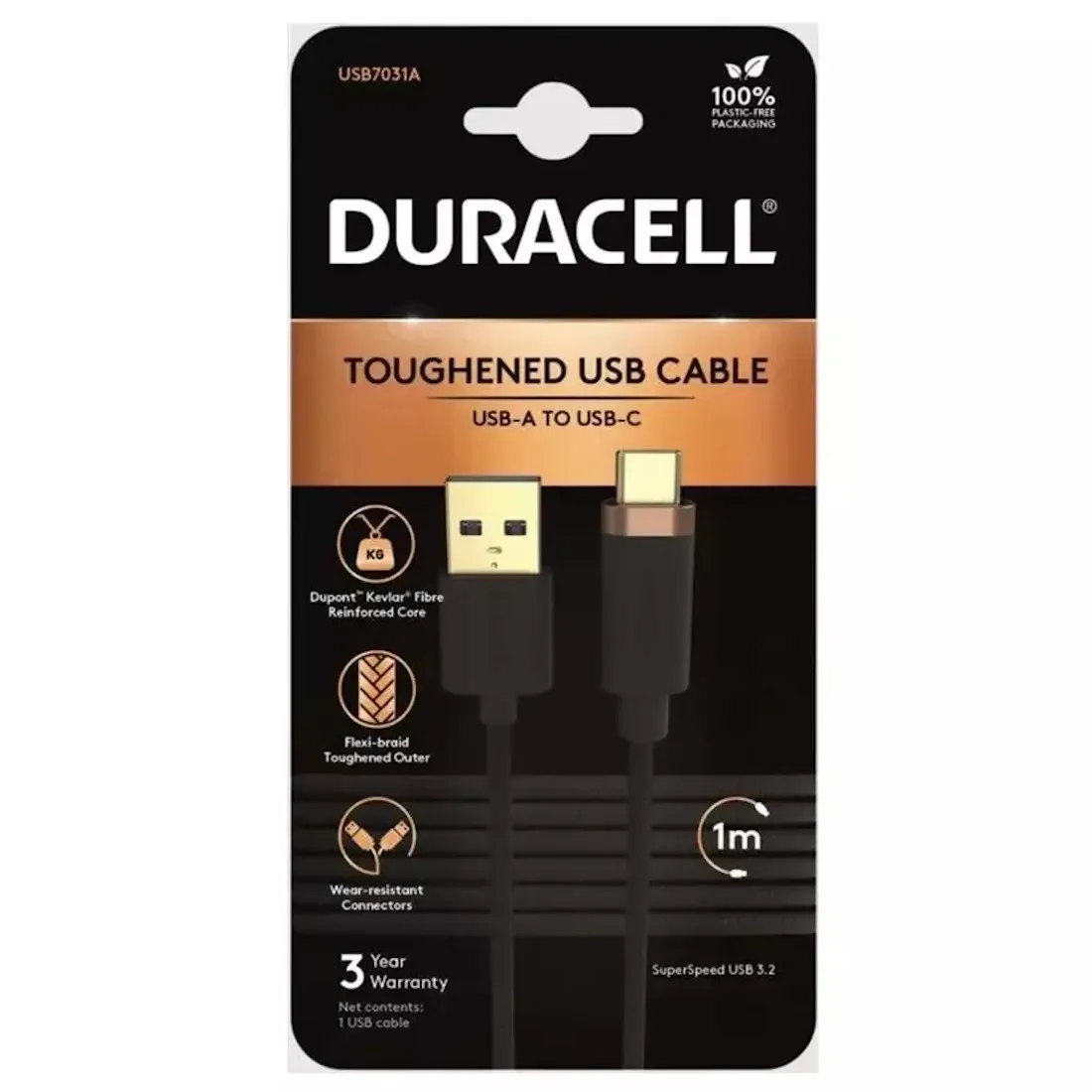Högkvalitativ USB A - USB C-kabel från Duracell. Längd 1 m. Svart färg. Snabb USB 3.2 Gen 1 dataöverföring. Ena änden har en klassisk USB-kontakt (A) och den andra en USB-C. Tre års garanti.