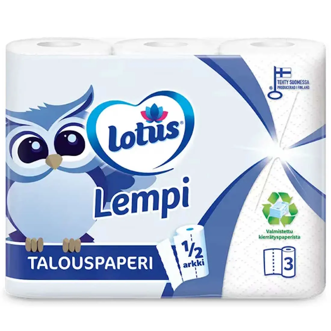 Lotus Lempi hushållspappersark är tillverkade i Finland, smidigt förpackade och lätta att ta ett ark i taget. En förpackning innehåller 120 ark, vilket motsvarar två rullar. Tillverkade av återvunna fibrer, FSC-certifierade och märkta med EU Ecolabel-miljömärket. Förpackningen är återvinningsbar. Passar för både hemmet och utomhusbruk.