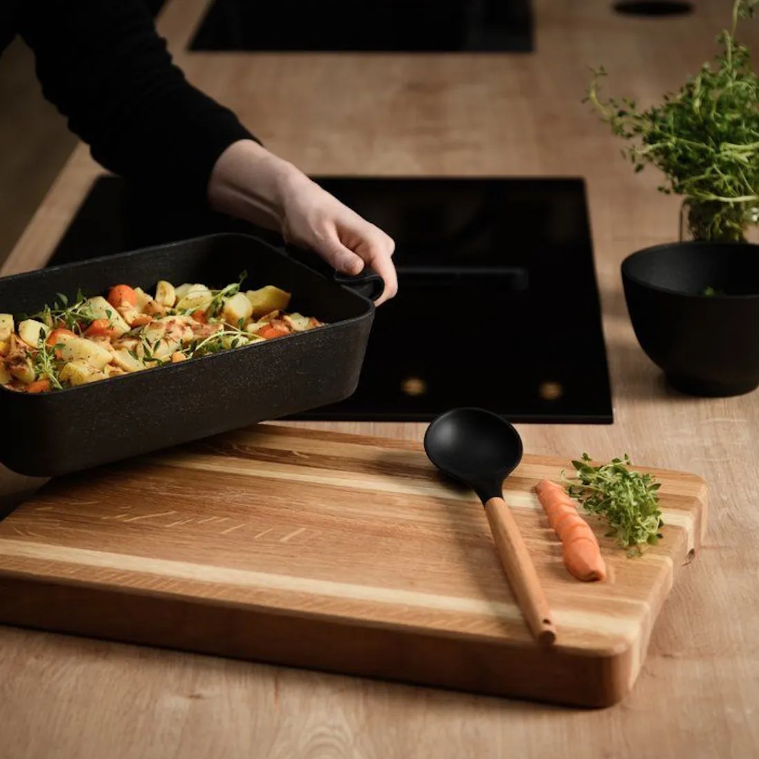 Skärbrädan fungerar även utmärkt som serveringsbräda. Regelbunden oljning förlänger brädans livslängd och förhindrar att träet torkar ut. Av hygieniska skäl rekommenderas separata brädor för kött och grönsaker.