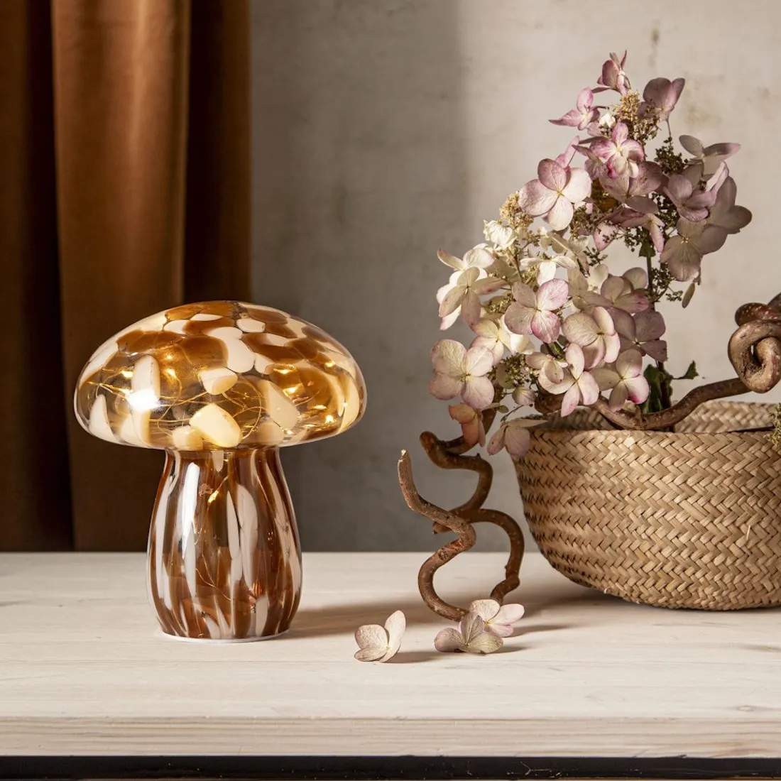 Funghi-dekorationen passar utmärkt på bordet, byrån eller hyllan för att skapa en mysig atmosfär. Den större storleken gör den till ett mer framträdande inredningsföremål som fungerar både på egen hand eller som en del av en grupp.