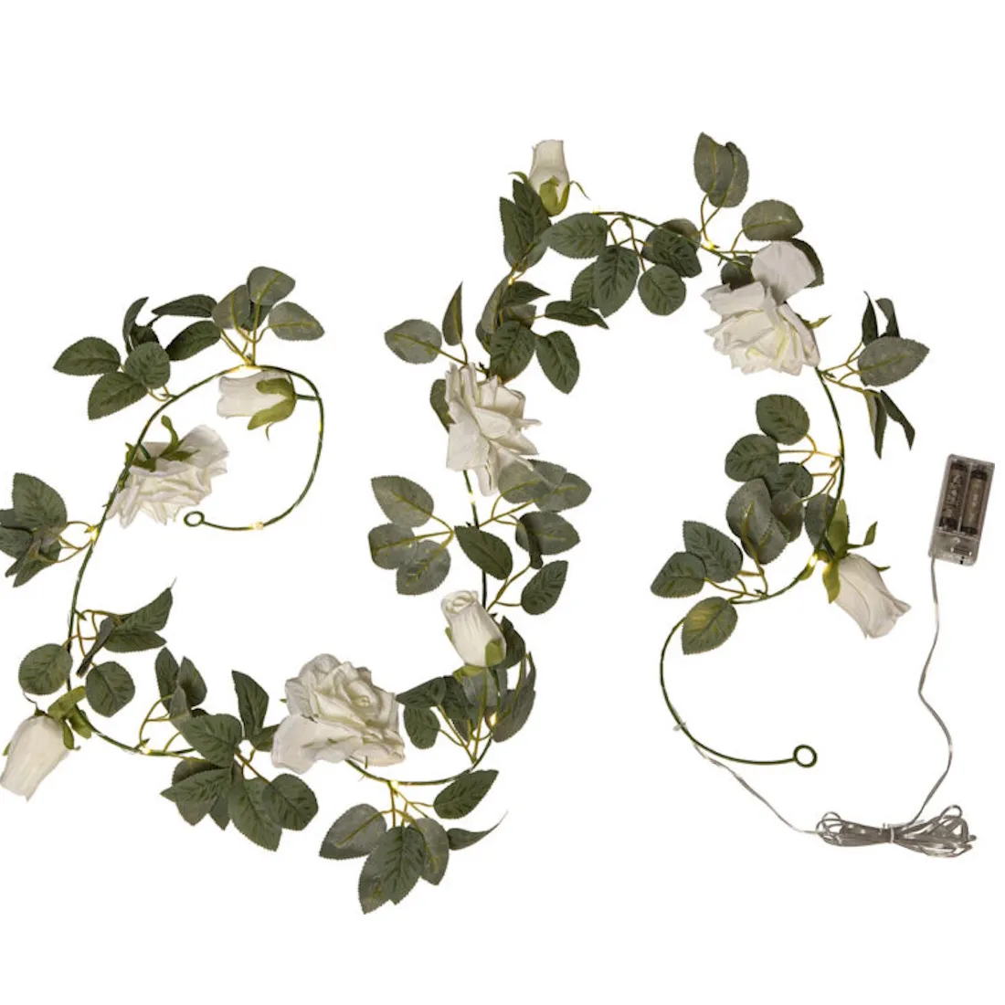 Star Trading Roza-ljusslinga är ett vackert och dekorativt inredningselement som kombinerar vita rosor med gröna blad. Den skira helheten skapar en naturnära känsla och mjuk belysning i hemmet.