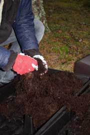 - Suodatinmateriaali jaetaan säkistä laatikoihin. Materiaali revitään ilmavaksi ja levitetään kevyesti taputtelemalla tasaisesti laatikkoon. Aloituspakkaus suodatinmateriaalia toimitetaan suodattimen mukana. Jaa yhden pussin sisältö viidelle suodatinlaatikolle. Lopuksi suodatinmateriaalia vedetään n. 5 cm taaksepäin laatikon purkupäässä olevien V-aukkojen edestä.