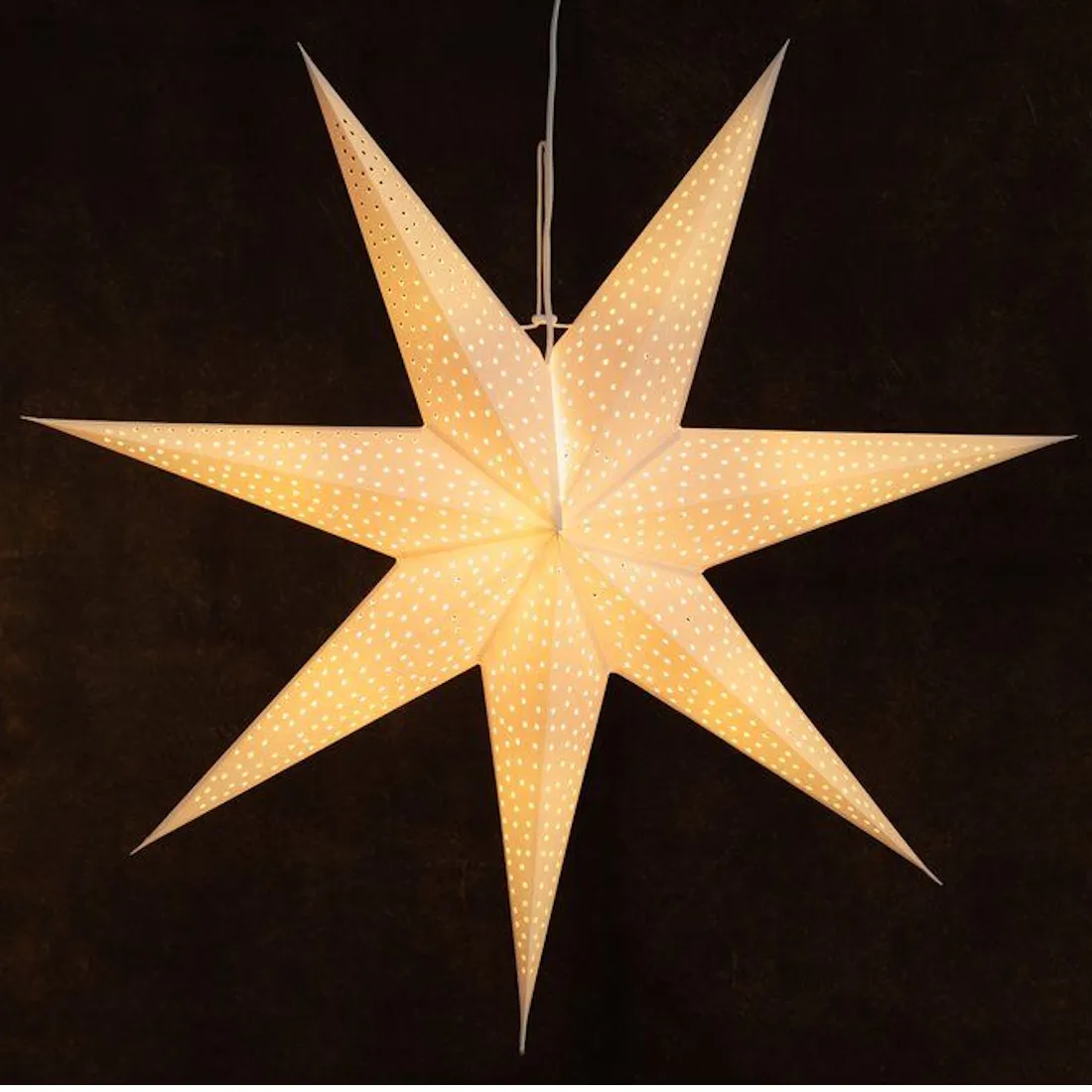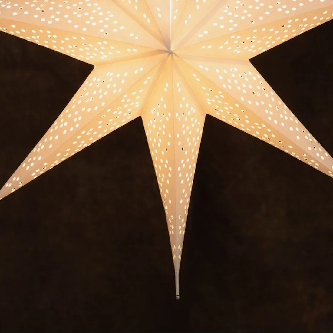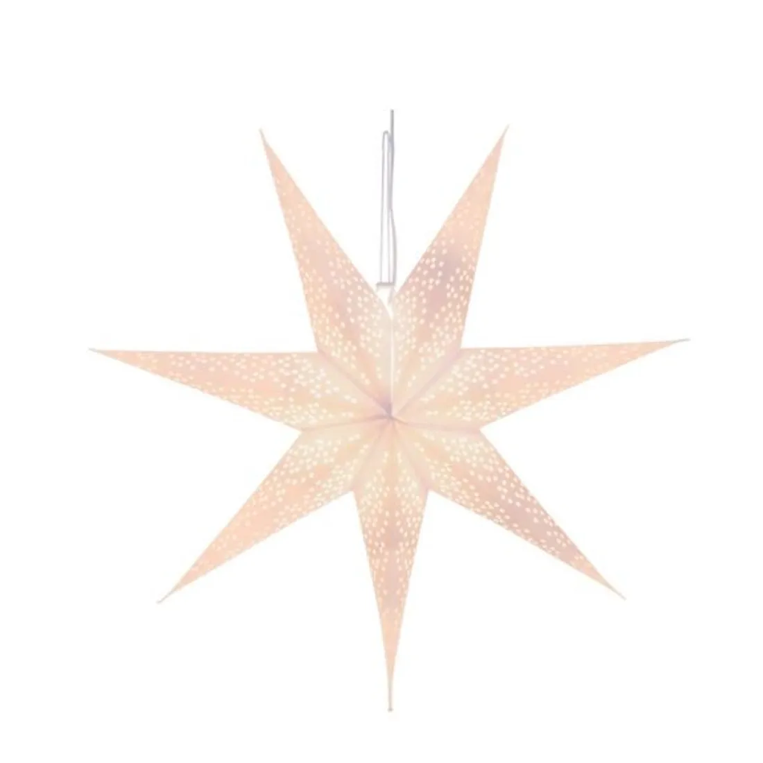 Tyylikäs ja tunnelmallinen seitsemänsakarainen paperitähti, jossa on hienostunut laserleikattu kuvio. Valo siivilöityy paperin läpi kauniisti, tuoden kotiisi lämpöä ja juhlavuutta joulun aikaan.