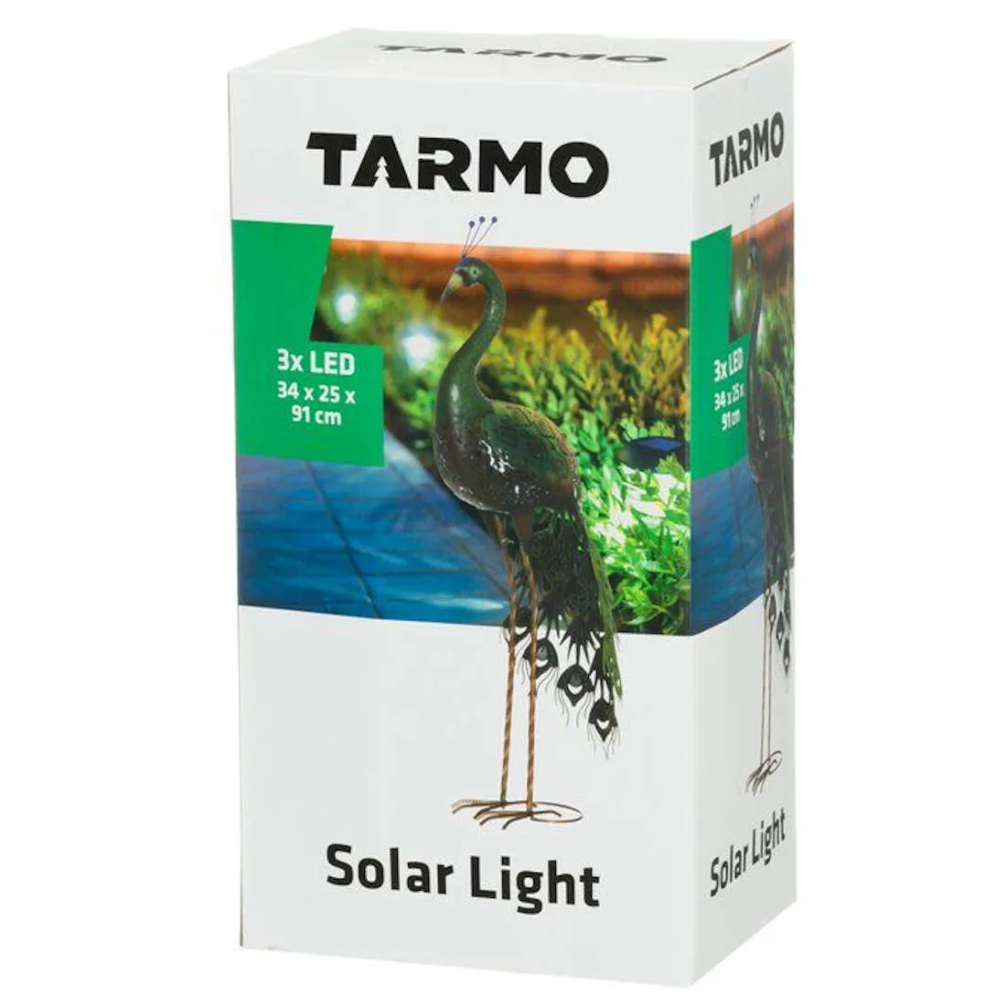 Tarmo Solar riikinkukko on koristeellinen metallinen pihakoriste, joka tuo pihaan, terassille tai istutusalueelle näyttävää ilmettä myös iltahämärässä. Riikinkukon muotoilu tekee siitä persoonallisen sisustuselementin ulkotiloihin.
