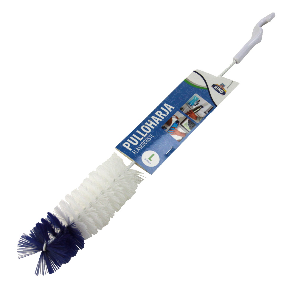 Aino pulloharjan sinivalkoiset nylonharjakset puhdistavat erikokoiset pullot. Pitkän kahvan ja pyöreän muotoilun ansiosta tuotteella puhdistuu hankalatkin kohteet, kuten kahvinkeittimen vesisäiliön nurkat. Harjan päässä on suuri ripustuskoukku, jonka avulla harja saadaan asetettua kuivumaan.