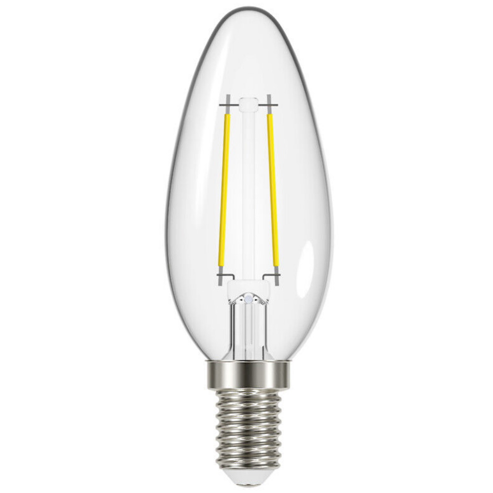 Kirkas kynttiläkupuinen filamentti led-lamppu 2,2W 3000K E14 250lm 15000h 35x98mm, pahvipakkaus. Taajuus ~50/60Hz.