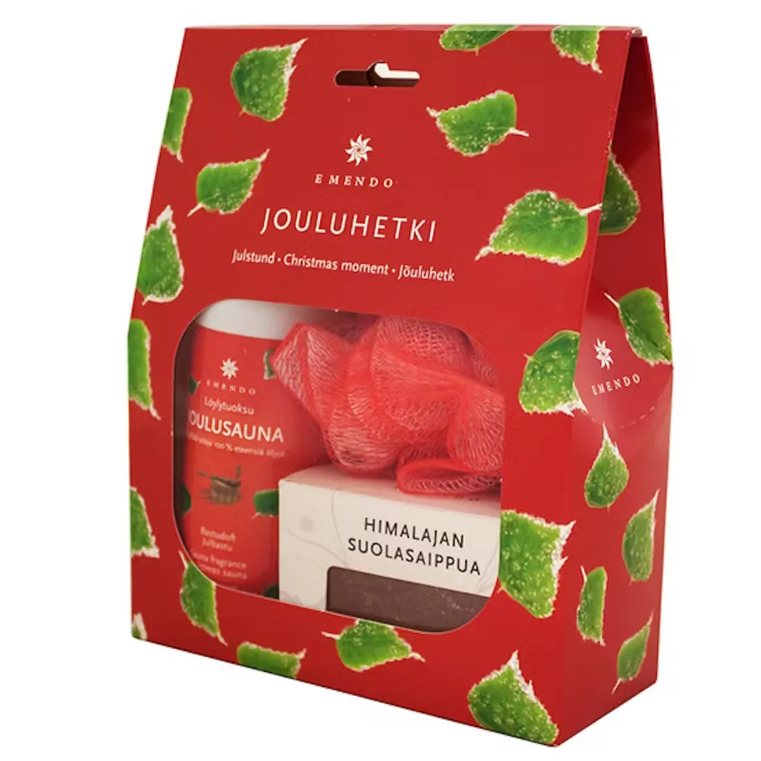 Jouluinen Emendo-lahjapakkaus tuo joulusaunaan tunnelmaa ja hyvää oloa. Se sisältää jouluisen saunatuoksun, joka sisältää aitoja 100 % eteerisiä öljyjä. Mukana oleva Himalajan suolasaippua on tutustumisen arvoinen puhdistava ja ravitseva tuote, joka sopii monille allergisille, atoopikoille sekä kuivalle iholle. Se puhdistaa ja ravitsee ihoa, sekä ylläpitää ihon kosteustasapainoa. Pakkauksessa myös pesuruusu.