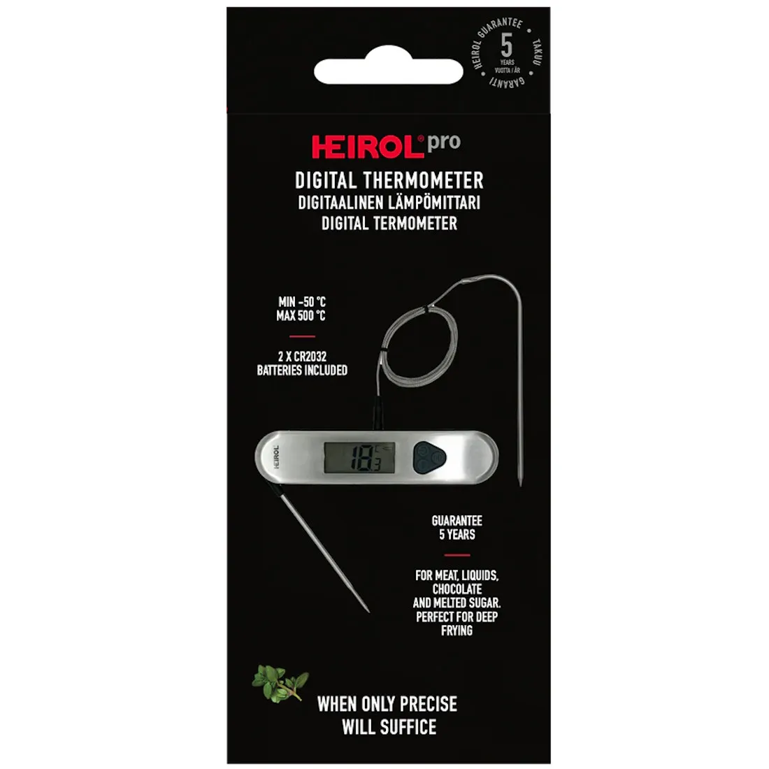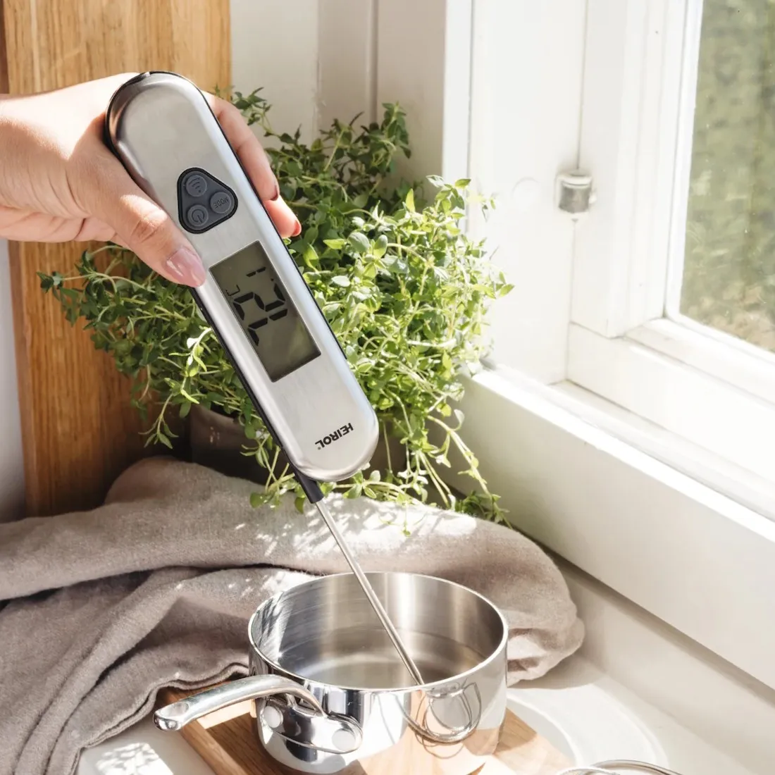 Monipuolinen ja tarkka HEIROL Steely -lämpömittari on täydellinen valinta ruoanlaittoon ja leivontaan. Mittaa lämpötilat desimaalin tarkkuudella kolmella eri tavalla: taittuvalla mittapäällä, anturijohdolla sekä sisäänrakennetulla laserilla. Soveltuu erinomaisesti esimerkiksi lihan, kastikkeiden, suklaan, sokerin ja nesteiden lämpötilan tarkkaan mittaamiseen. Täydellinen kumppani myös uppopaistamiseen!