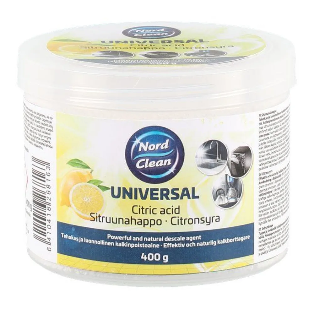 Luonnollinen tehokas kalkinpoistaja. Käyttökohteet: kylpyhuone ja keittiö, esimerkiksi astianpesukoneen ja kahvinkeitinten kalkinpoistoon. 400 g muovipurkki. Jauhemainen koostumus.