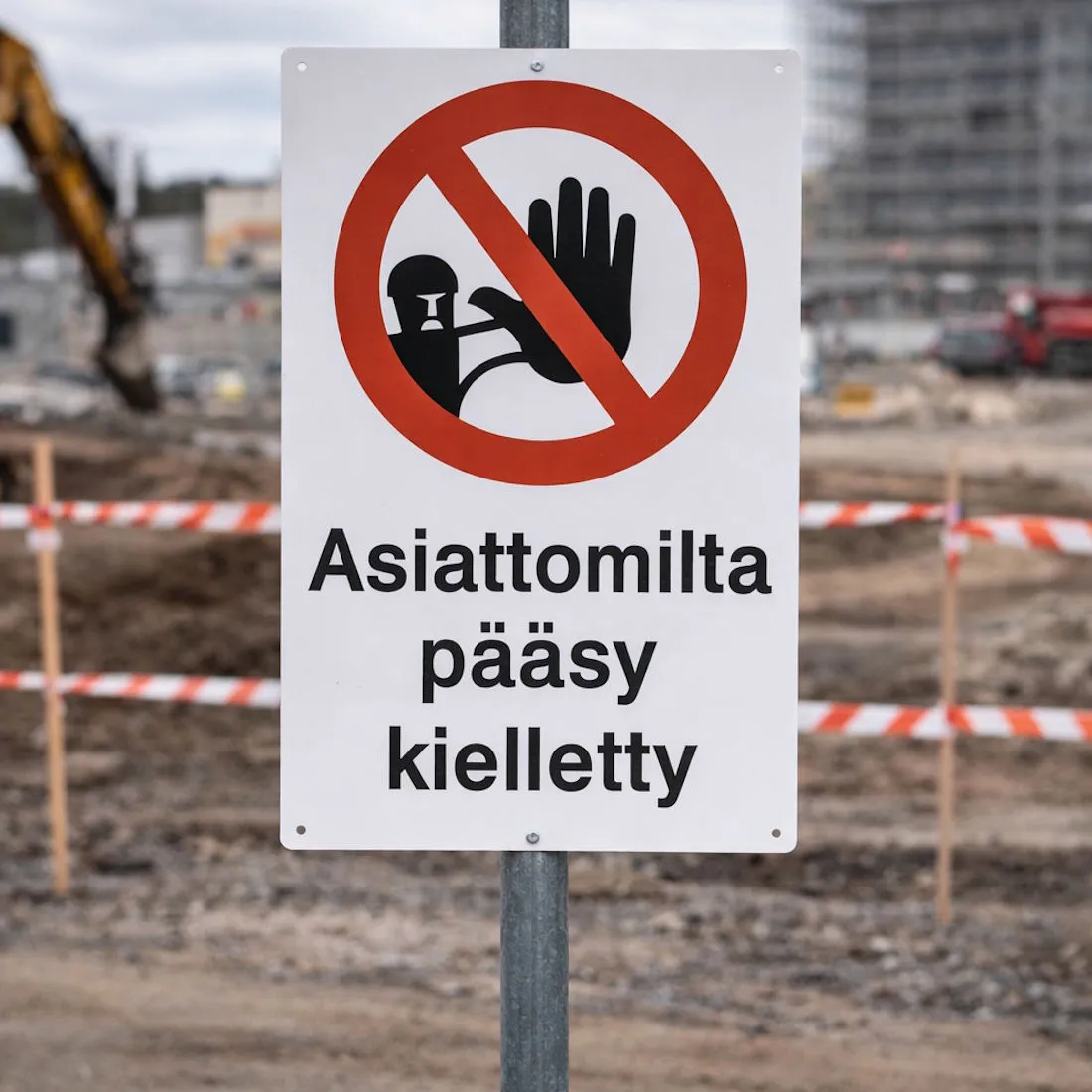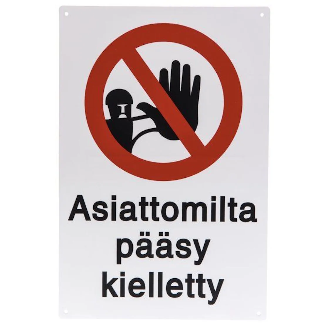 Asiattomilta pääsy kielletty-opastekyltti. Valmistettu kestävästä muovista. Kyltin kulmissa valmiit kiinnitysreiät.