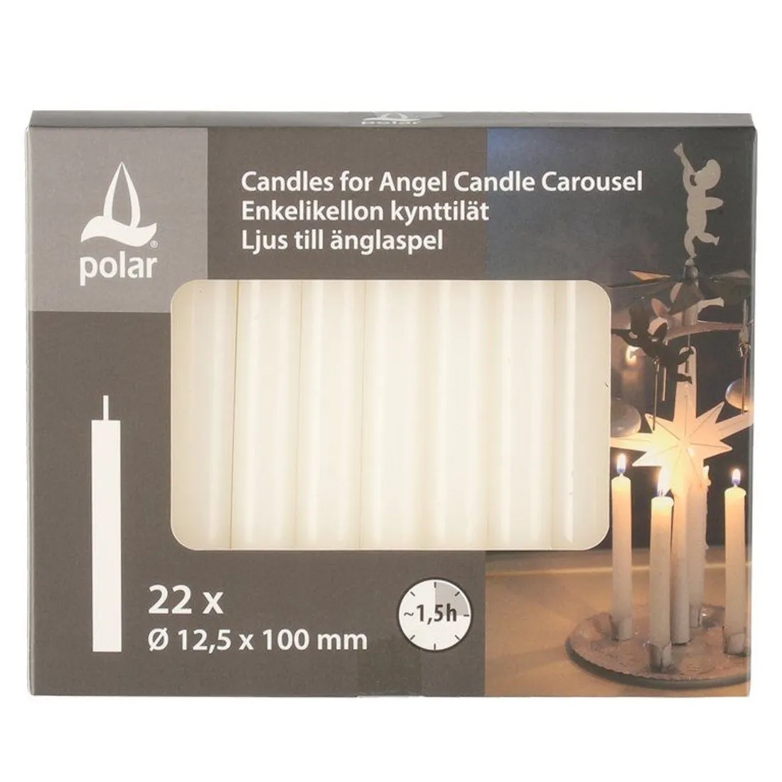 Kynttilät enkelikelloon. Kynttilän pituus 10 cm, halkaisija 1,25 cm. 22 kpl/pakkaus. Paloaika noin 1,5h.