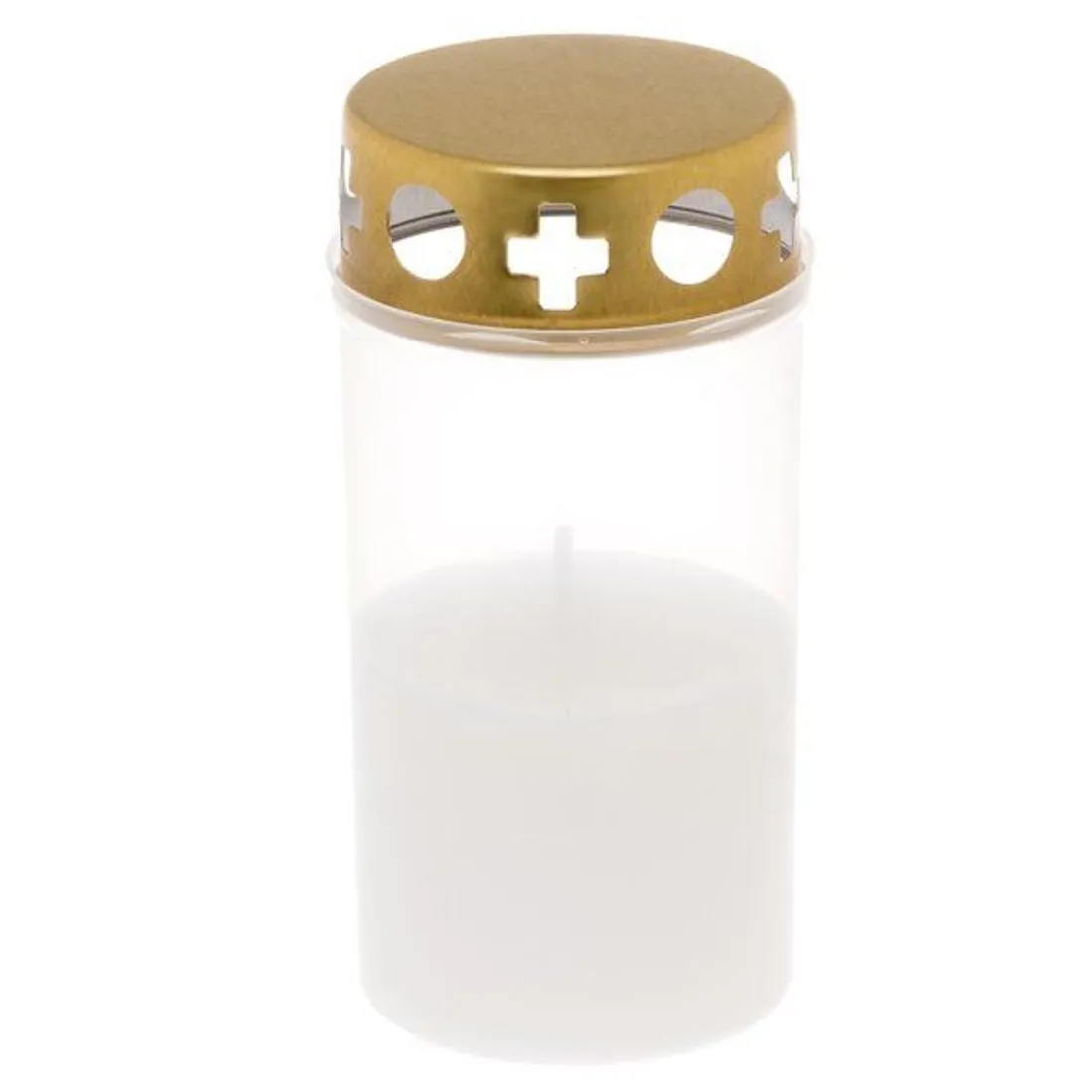 Hautakynttilä kullanvärisellä tuulisuojalla. Paloaika noin 36 tuntia.