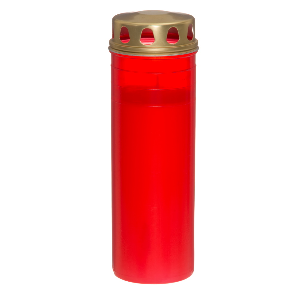 Punainen hautakynttilä kullanvärisellä tuulisuojalla. Paloaika noin 120 tuntia.