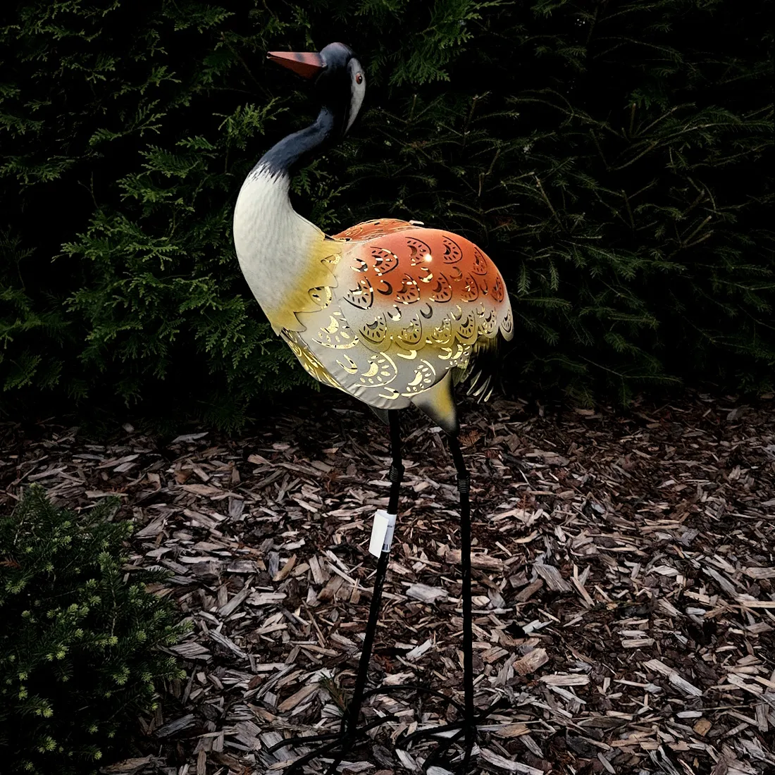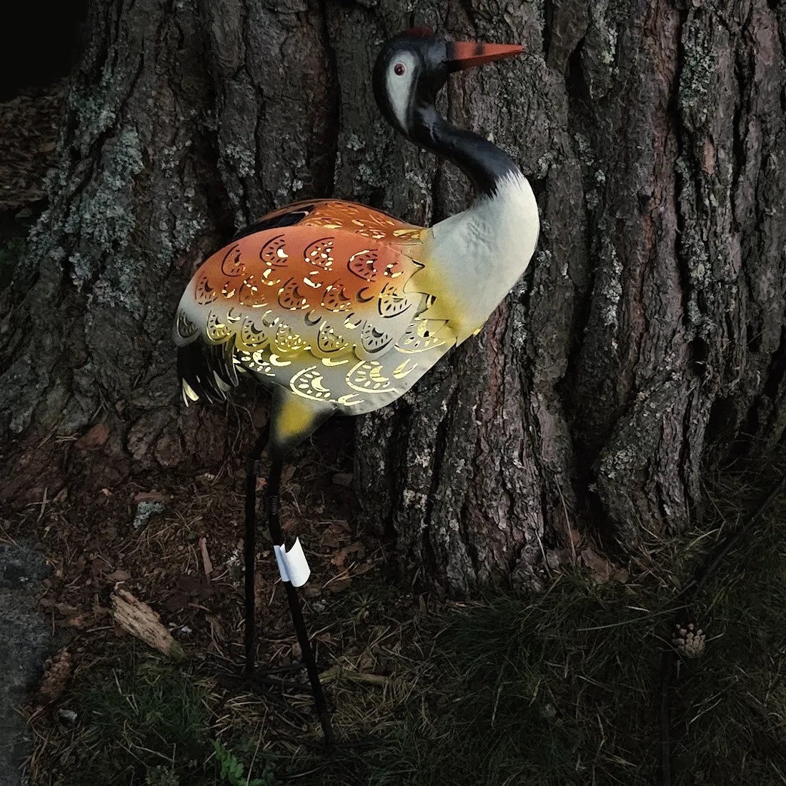 Metallinen kurjen näköinen pihakoriste. Hämärän tullen kurjen sisällä oleva led valo syttyy ja kurjen läpi kuultaa valoa ja pihalle/ seinälle muodostuu koristeellisia valokuvioita. Akku 1,2V AA 600mAh Ni-MH. 3 kpl LED. On/Off-kytkin. Aurinkopaneelin koko 4 x 7 cm. Takuu 1 vuosi.