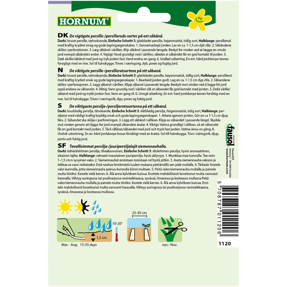 Darki: kähärälehtinen persilja, tiheäkasvuinen, Einfache Schnitt 3: silolehtinen persilja, hyvin aromaattinen, aikainen lajike, Halblange: vahvasti mausteinen juuripersilja, hyvä säilyvyys. 1. Muokkaa maa kunnolla. Tee noin 1–1,5 cm:n syvyinen vako. 2. Siemennauhat erotetaan toisistaan rei’itystä pitkin. 3. Aseta siemennauha vakoon ja leikkaa se vaon mittaiseksi. Estä nauhaa lentämästä tuulen mukana peittämällä sen päät mullalla. 4. Tärkeää: Kastele vako kunnolla, jotta siemennauha painuu kunnolla kiinni multaan. 5. Peitä vako/siemennauha mullalla ja painele multa tiiviiksi. Kastele vielä kerran. 6. Älä anna kylvöksen kuivua. Erottele mahdollisesti kovettunut multa varovasti haravalla. Viihtyy auringossa tai puolivarjossa ravinteikkaassa, syvässä, ilmavassa ja kosteassa mullassa.Peitä vako/siemennauha mullalla ja painele multa tiiviiksi. Kastele vielä kerran. 6. Älä anna kylvöksen kuivua. Erottele mahdollisesti kovettunut multa varovasti haravalla. Viihtyy auringossa tai puolivarjossa ravinteikkaassa, syvässä, ilmavassa ja kosteassa mullassa.
