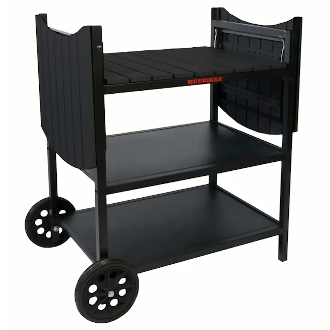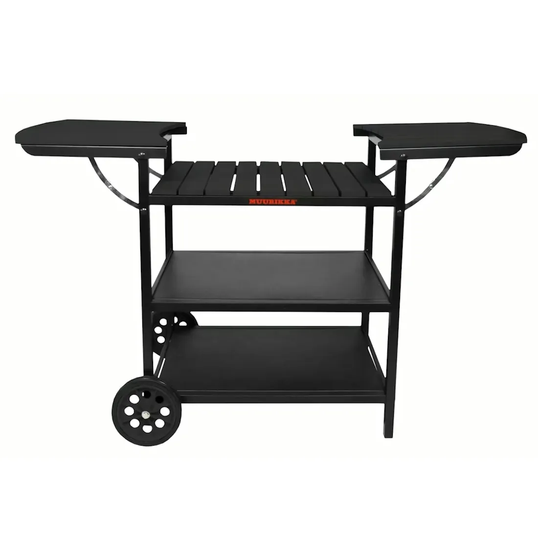 Kesäkeittiövaunun pyörät helpottavat kokonaisuuden liikuttelua. Laskettavat sivutasot tuovat lisää työskentelytilaa ruoanlaittoon, ja ne voidaan taittaa alas säilytystä varten, jolloin vaunu vie vähemmän tilaa. Vaunussa on myös runsaasti säilytystilaa pannuille, savustusastialle ja muille tarvikkeille.