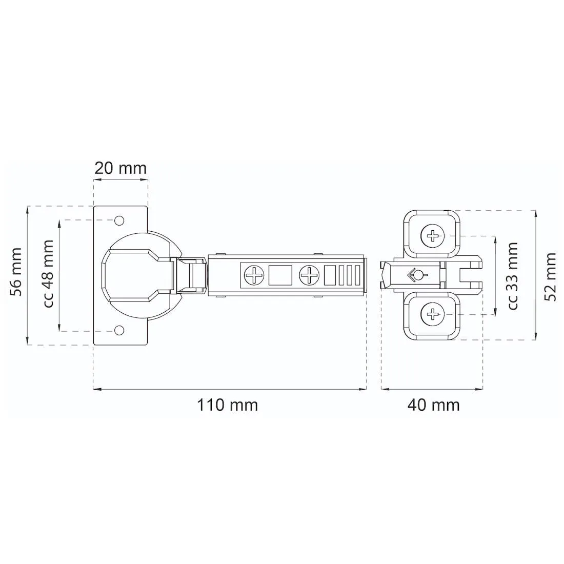 Sarana on kokonaan peittävä, ja sen 110° aukipitokulma tarjoaa sujuvan ja esteettömän pääsyn kaapin sisälle. Asennus onnistuu yleiseen ø 35 mm upotukseen.