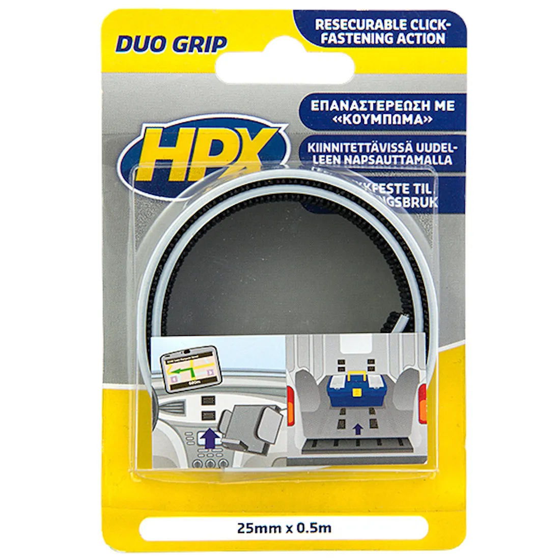 HPX Duo Grip on innovatiivinen, irrotettava ja uudelleenkiinnitettävä kiinnitysnauha, joka tarjoaa huomattavasti vahvemman pidon kuin perinteiset tarrakiinnitykset. Erikoisvalmisteinen koukkurakenne tarttuu toisiinsa tehokkaasti, ja paras kiinnitys saavutetaan, kun koukut painetaan täysin yhteen. Soveltuu sekä kevyisiin että voimakkaasti kuormitettuihin kohteisiin.